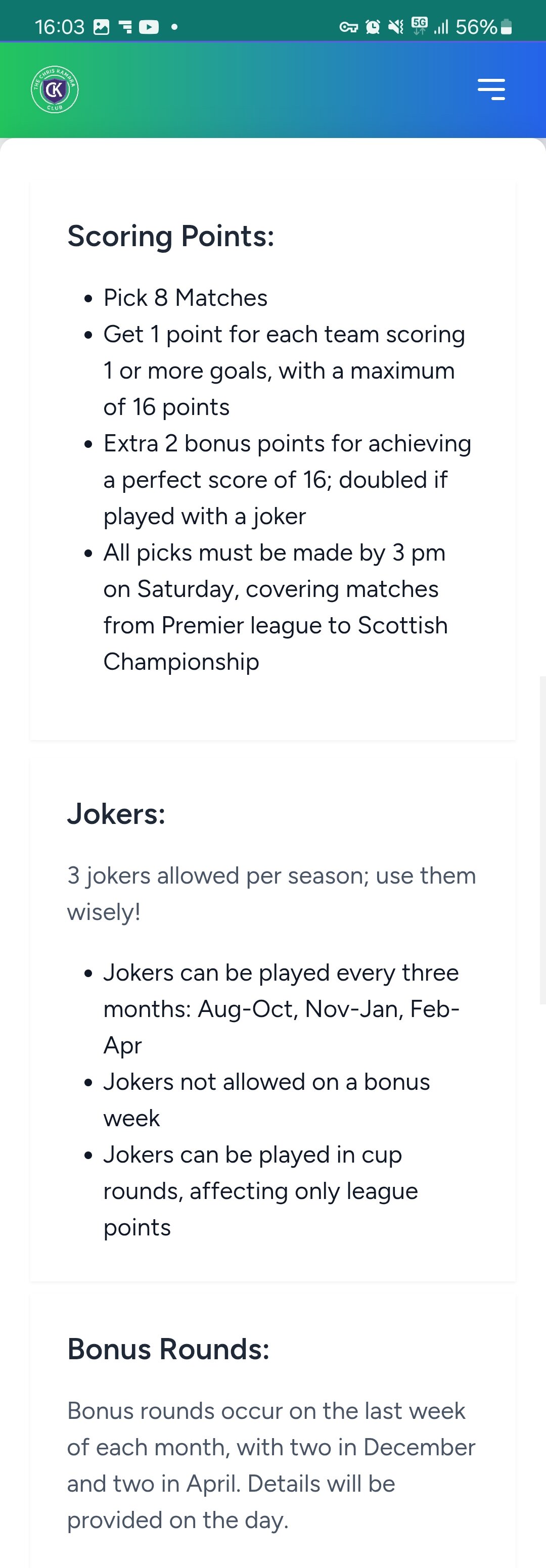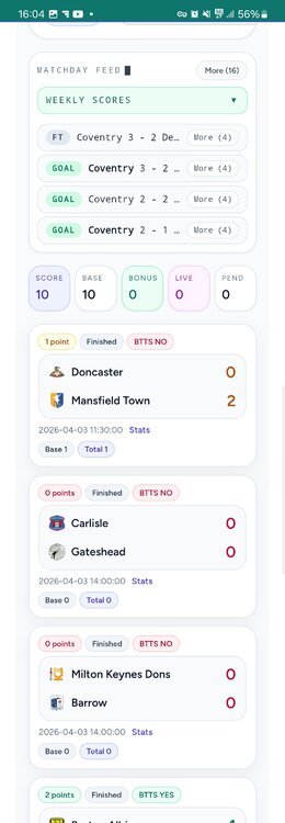 Hi guys, Im new to the forum...and thought I'd post a competition i run ... I run a football prediction app with a twist.... The game is predicting Both teams to score - (aka The Chris Kamara club) Pick 8 fixtures per week from the major English divisions. 1 point for a team in your selection that scores a goal or more. (16 points max) This current season there are 22 players all entering a 1 time payment of £10 at the start of the season which goes into a prize pool plus a small payment to the site running costs (shared small cost depending how many enter). THE COMPETITION IS NON PROFIT Here are some screenshots below. The app iss fully live and automatically scored using an api and live page updates to the scores. live results page: if you are interested in joining for the 26/27 season or want more information - contact me here. Thanks, Nathan - a spurs fan!